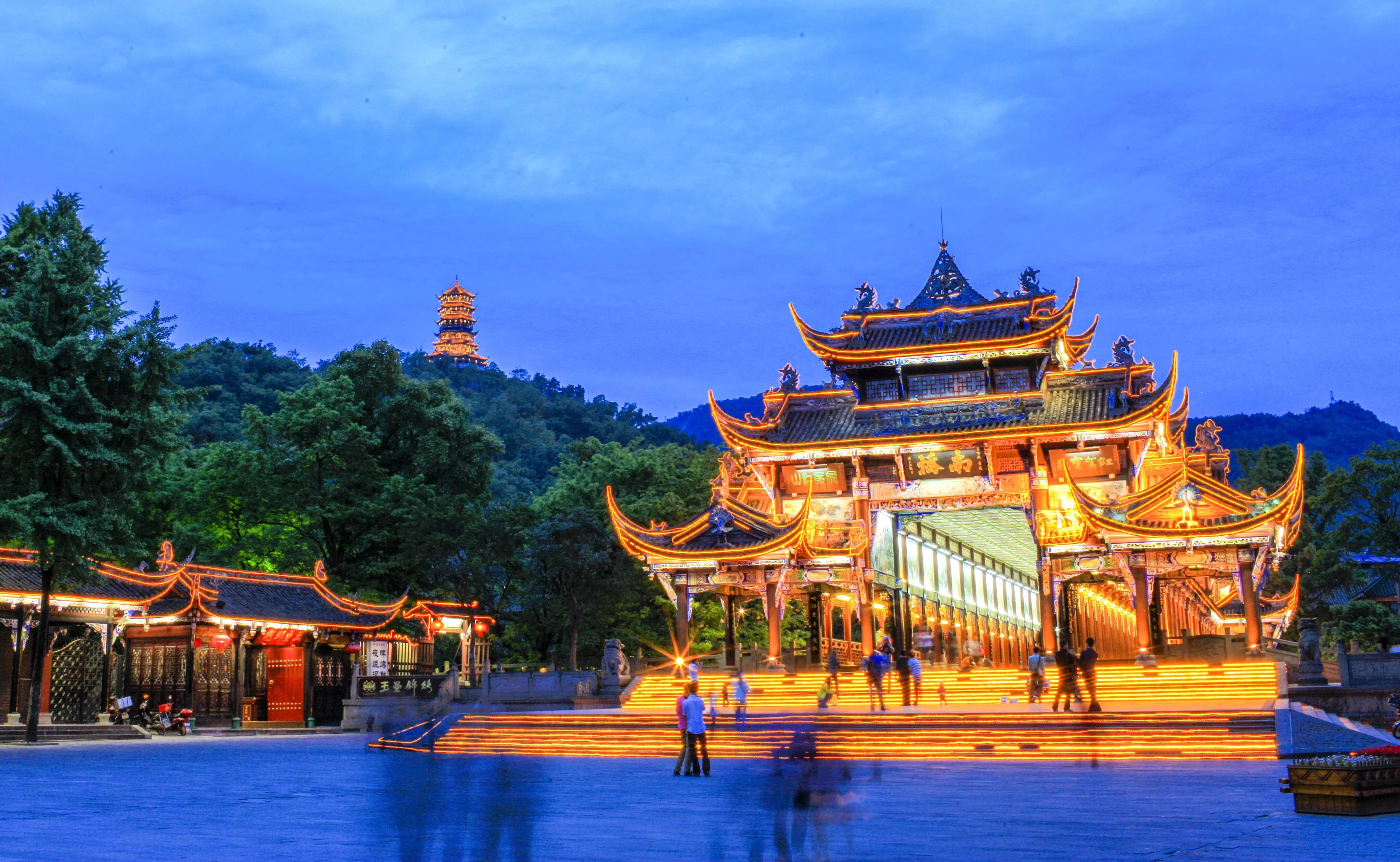 建议下午游览都江堰,傍晚看灯光亮起的神秘瞬间。蓝色江水与古堰工程形成强烈对比,拍出的照片浪漫梦幻、十分震撼。