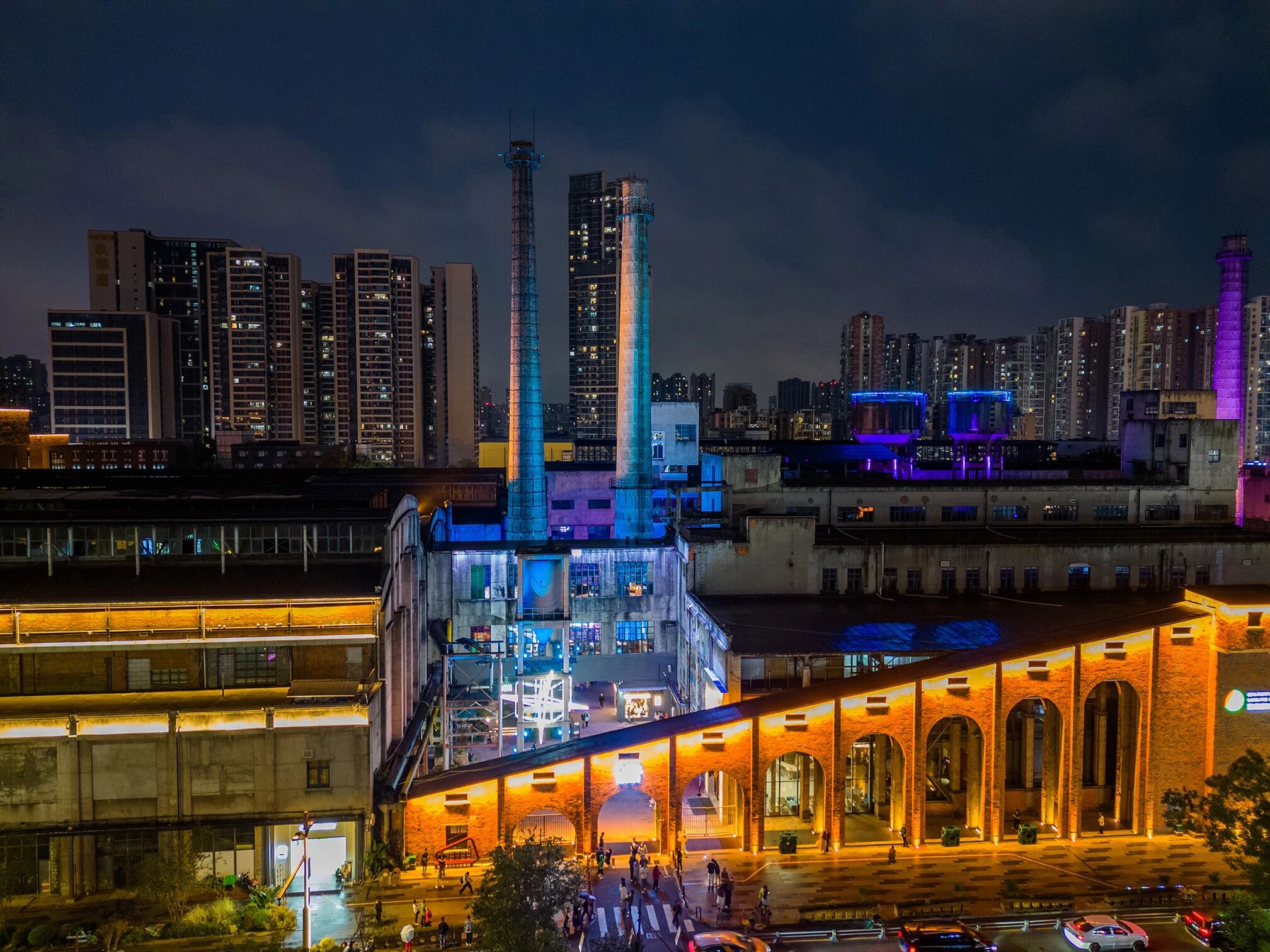 如果想看不一样的灯光,一定要来东郊记忆!这里的灯光设计巧妙融合工业遗产与时尚元素,老厂房、红砖墙、火车头在灯光点缀下焕发新生,既保留历史厚重感,又注入赛博朋克般的炫酷气质。灯光不打亮全部,而是精准勾勒建筑轮廓,营造出朦胧又充满张力的夜景效果。
