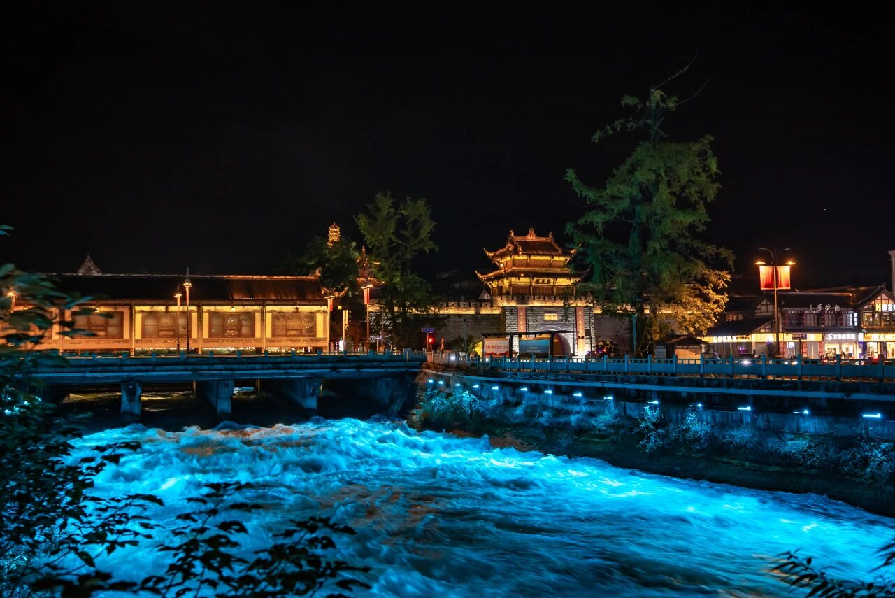 离市区稍远但绝对值得一去的奇幻夜景!夜晚的都江堰南桥和仰天窝鱼嘴,通过特殊的蓝色灯光照射江水,整个岷江水变成晶莹剔透的“蓝眼泪”,与古建筑的灯光交相辉映,创造出一种超现实的梦幻景观,既壮观又浪漫。