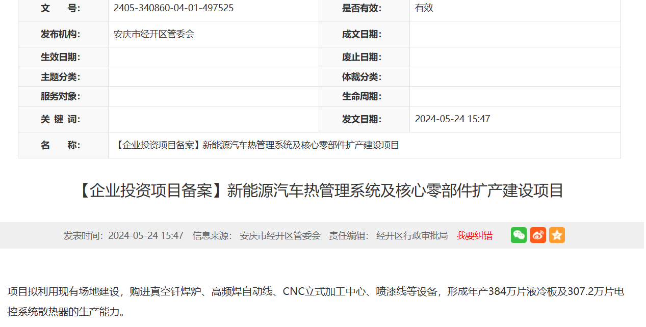 但根据安庆市经开区管委会于2024年5月发布的“【企业投资项目备案】新能源汽车热管理系统及核心零部件扩产建设项目”,其中提到:“项目拟利用现有场地建设,购进真空钎焊炉、高频焊自动线、CNC立式加工中心、喷漆线等设备,形成年产384万片液冷板及307.2万片电控系统散热器的生产能力。”这篇政府信息公开内容针对该项目的“企业投资项目备案”描述,与《审核问询函的回复》中披露存在很大差异。